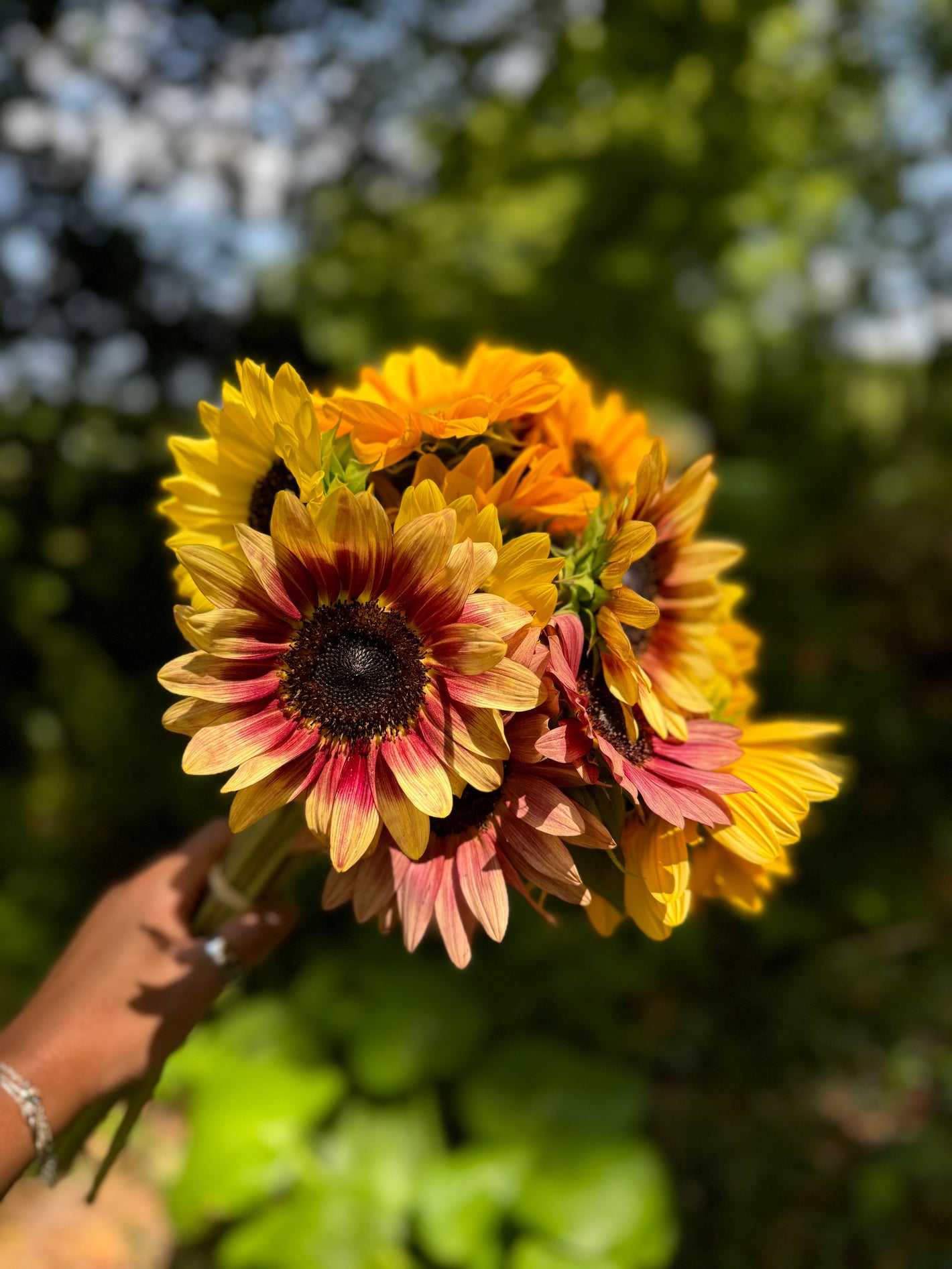 Full bouquet of assorted cut flowers like sunflowers, zinnias, dahlias, dianthus, celosia, cosmos, lisianthus either wrapped in paper or tied together with twine. Give the stems a snip when you get home and place in your favorite vase. -