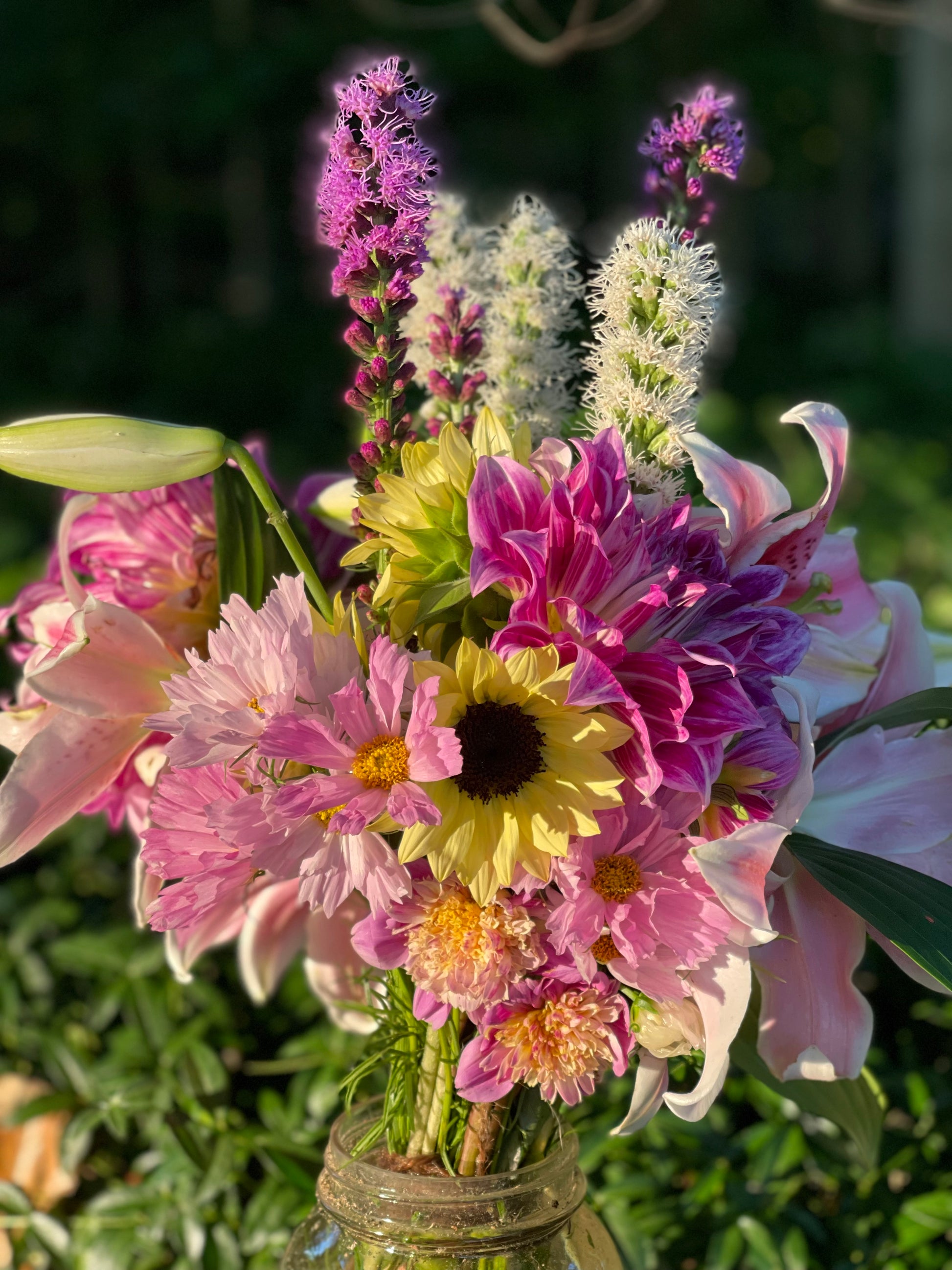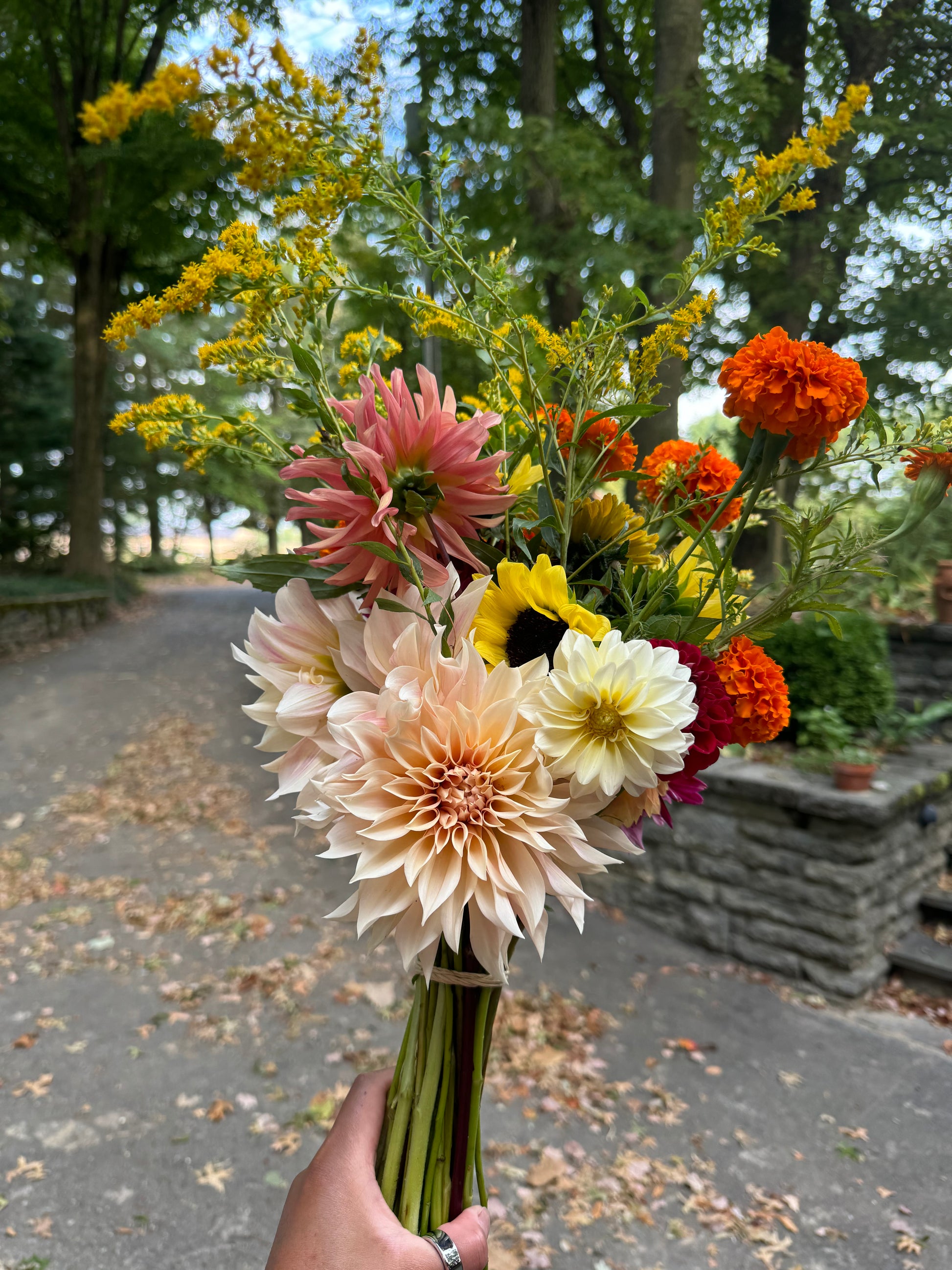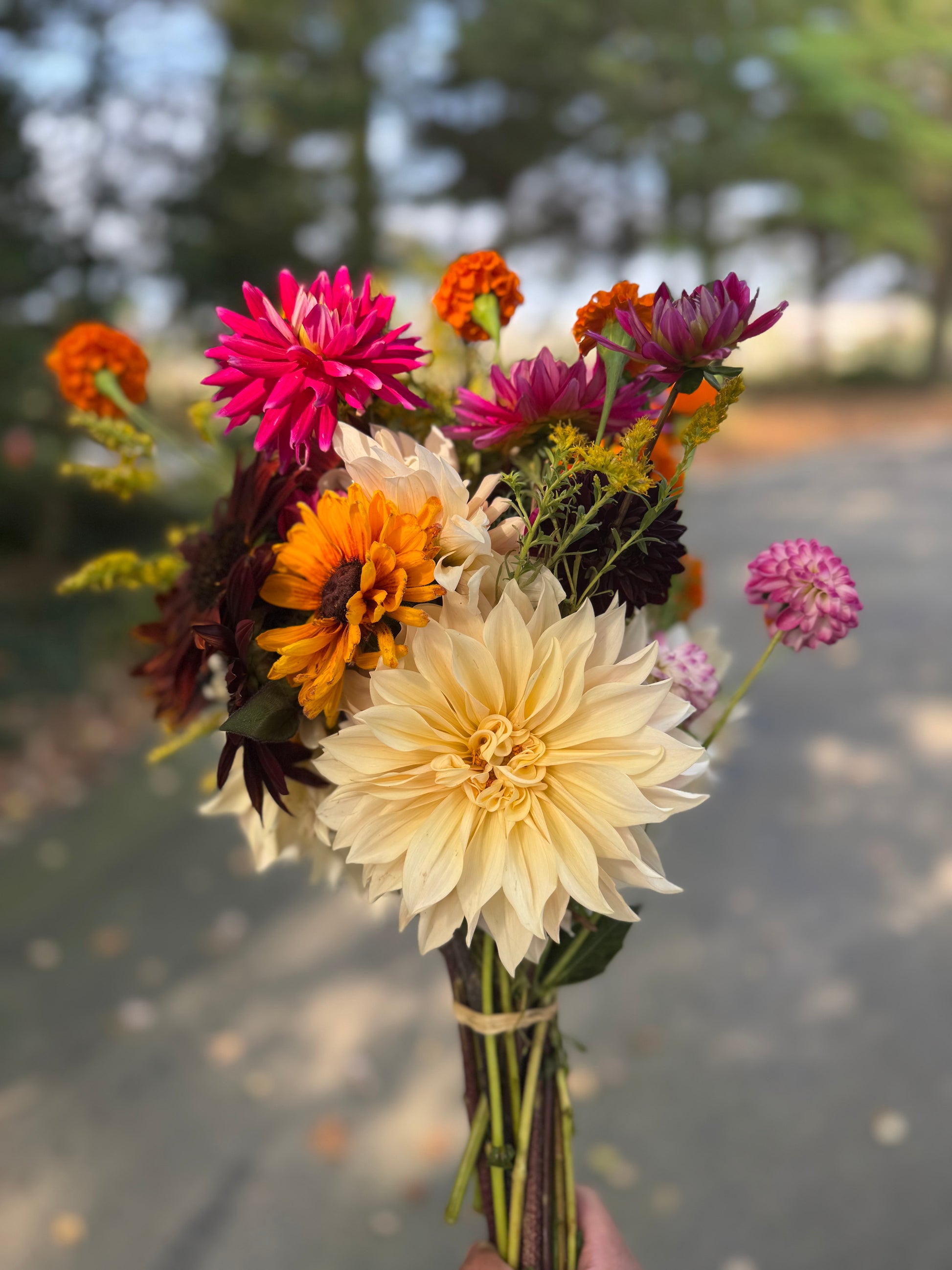 Full bouquet of assorted long stemmed cut flowers like sunflowers, zinnias, dahlias, dianthus, celosia, cosmos, lisianthus either wrapped in paper or tied together with twine. Give the stems a snip when you get home and place in your favorite vase.